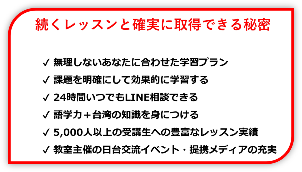 台湾中国語はもちろん、礼儀や人柄もしっかりした人材を選んでいます。 更に日本語も話せる講師ということでわからない事があれば日本語で質問できるのは大きなポイントですね。