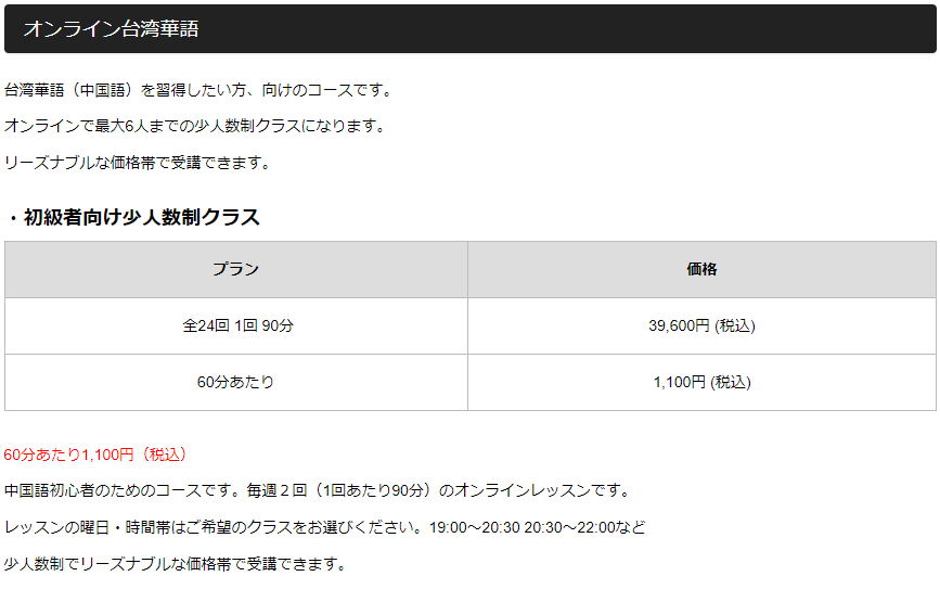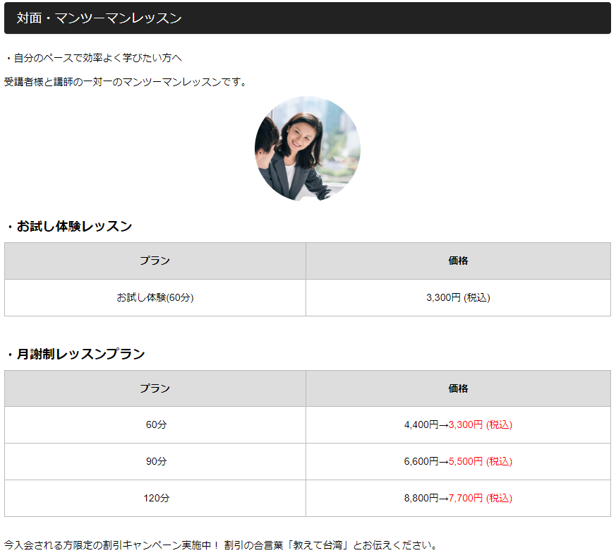 中国語と台湾の文化生活について講師が対面(近所のカフェ)やオンラインで授業します。実際に対面で話すと口の動きやネット環境に左右されずに、正しい中国語が学べるのは大きいですね。しかし交通費などが実費になってしまうので、割高に感じる方もいらっしゃるかもしれません。私のように日本在住時は田舎だと難しいのでオンラインが良いかもしれませんね。