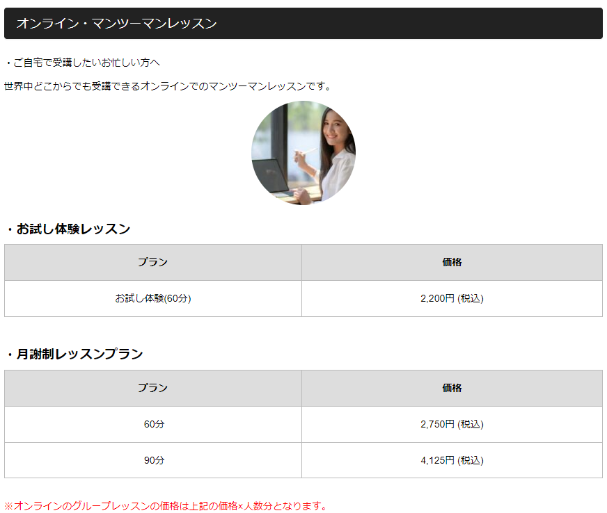 レッスン内容ですが、テキストを使ってオンラインでマンツーマンかグループレッスンが基本です。 自分でマンツーマンかグループか選べるので、恥ずかしがり屋さんはマンツーマンを選ぶと良いかもしれませんね。お試しレッスンが1時間2200円なので、まず一回試してみてはどうでしょうか。